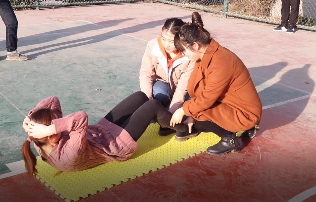 The last level of sit-ups for the girls to suppress red face, full strength, for the team race against time.