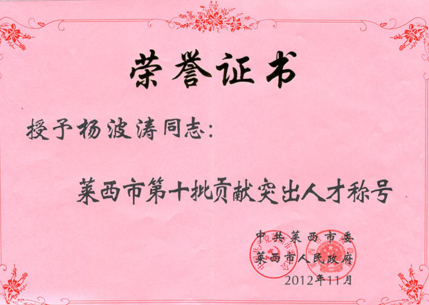 CEO Mr Yang Botao was awarded the honorary title of "Laixi cityoutstanding talent for contribution "on Jan 10th2013.