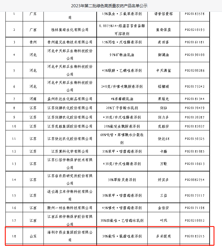 ? ? ? ? 參照T/CCPIA 170-2021《綠色高質量農(nóng)藥產(chǎn)品評價規(guī)范》團體標準為基礎,中國農(nóng)藥工業(yè)協(xié)會開展了綠色高質量農(nóng)藥產(chǎn)品申報工作。最終,經(jīng)協(xié)會形式審查并組織專家綜合審定,由農(nóng)藥生產(chǎn)/經(jīng)營單位自愿申報的43個產(chǎn)品中有36個產(chǎn)品符合T/CCPIA 170-2021標準要求并進入了“第二批綠色高質量農(nóng)藥產(chǎn)品公示名單”。海利爾藥業(yè)集團股份有限公司專利產(chǎn)品多米提亮(有效成分:20%氟嗎啉 · 10%氰霜唑懸浮劑成功入圍名單。