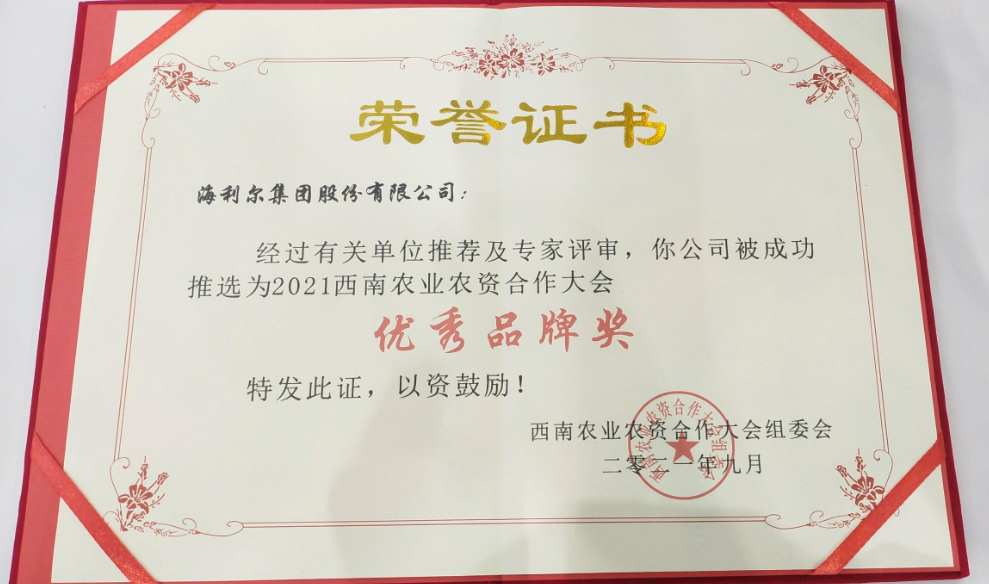 ? ? ? ?9月中旬,在四川成都舉辦西南農(nóng)業(yè)農(nóng)資合作大會上,海利爾榮獲大會“優(yōu)秀品牌獎”。