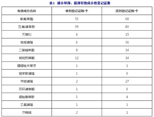 ??? 2018年水稻田除草劑登記數(shù)量部分見表1,從登記數(shù)量來看,單劑和混劑的登記數(shù)量相當。