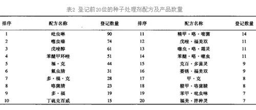 ??? 截至2017年底,取得登記的種子處理劑共涉及45種有效成分(表1),前5位有效成分為福美雙、克百威、吡蟲啉、噻蟲嗉、戊唑醇,含有這5種有效成分的產(chǎn)品總和占登記總量的50%以上;共有登記配方164個(gè)(包括38種單劑產(chǎn)品),登記數(shù)量前20位的配方(表2)。