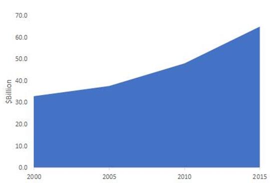 圖2. 農(nóng)化產(chǎn)品的銷(xiāo)售額逐年增長(zhǎng)(單位:十億美元 來(lái)源:BIS研究所分析)