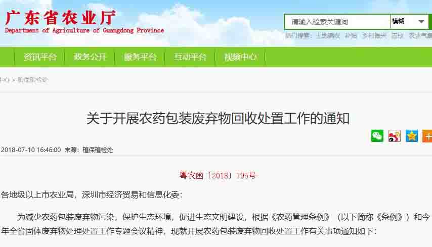 ? ? 日前,廣東省農(nóng)業(yè)廳發(fā)出《關(guān)于開(kāi)展農(nóng)藥包裝廢棄物回收處置工作的通知》,要求各級(jí)農(nóng)業(yè)部門(mén)嚴(yán)格執(zhí)法,加強(qiáng)農(nóng)藥包裝廢棄物回收的執(zhí)法監(jiān)管,將其列為農(nóng)業(yè)行政執(zhí)法的重要內(nèi)容。農(nóng)藥生產(chǎn)企業(yè)、農(nóng)藥經(jīng)營(yíng)者不履行農(nóng)藥廢棄物回收義務(wù)的,按有關(guān)規(guī)定予以嚴(yán)懲。