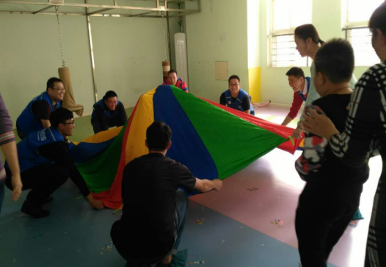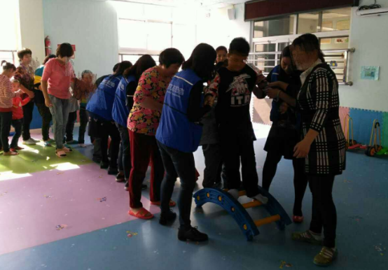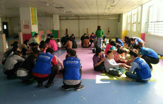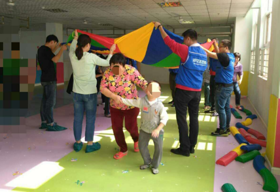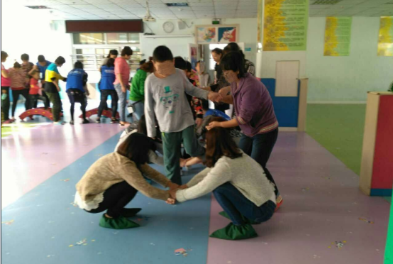而后,在老師的指導(dǎo)下,志愿者們陸續(xù)開始和孩子們互動(dòng)起來,協(xié)助家長一起做康復(fù)訓(xùn)練。到了孩子們的上課時(shí)間,志愿者們便一起做起了互動(dòng)游戲。盡自己的最大努力去跟孩子們溝通、互動(dòng),別無他求,只愿他們開心、快樂!