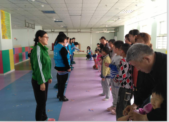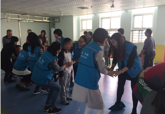 走到二樓活動(dòng)室,正好趕上他們互動(dòng)游戲課程,這些孩子對(duì)陌生人都有一定的抵觸感,所以在老師的引導(dǎo)下,志愿者們通過(guò)簡(jiǎn)單的互動(dòng)、自我介紹、擁抱等方式建立了初步友誼,小朋友們慢慢的笑起來(lái)。