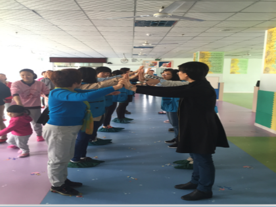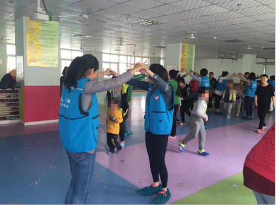 接下來(lái)就是“快樂(lè)的小火車”游戲,志愿者們主動(dòng)搭起了“火車軌道”。